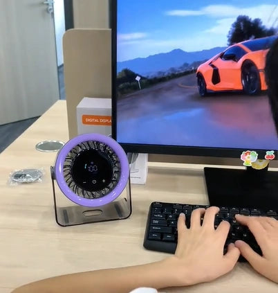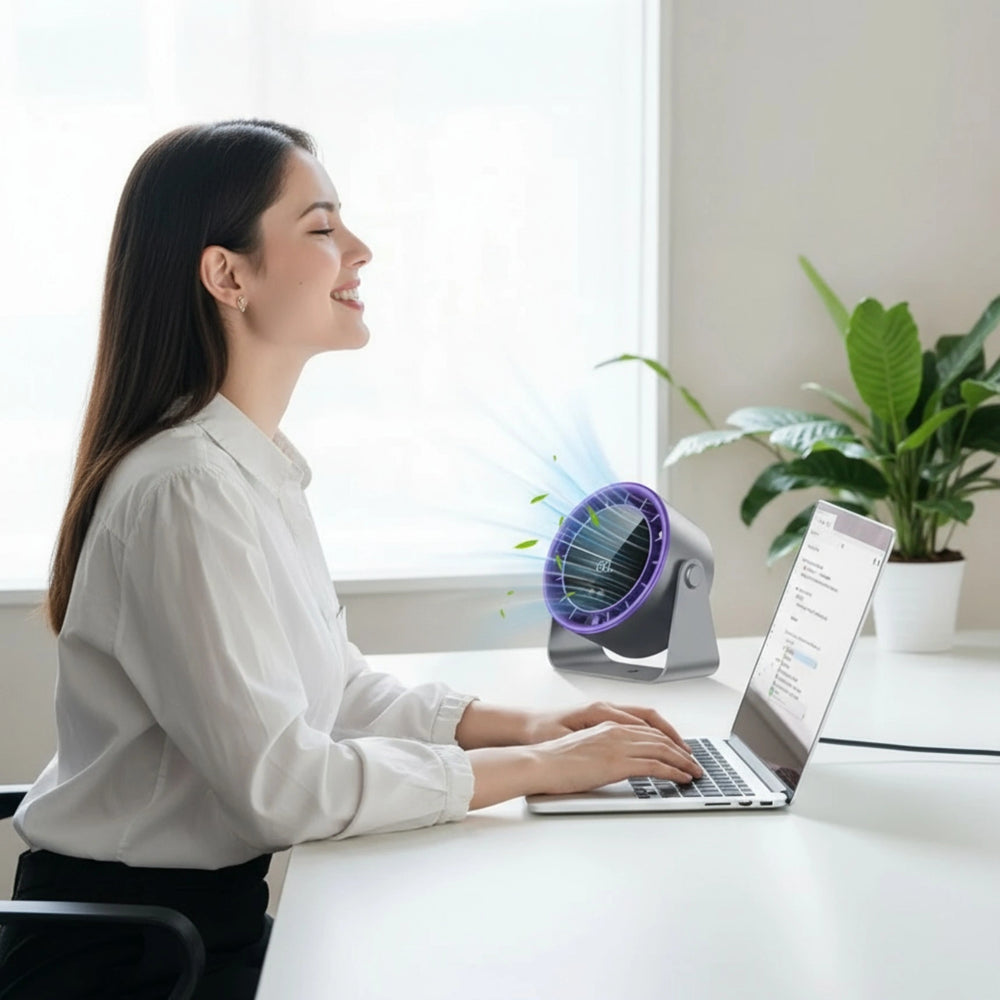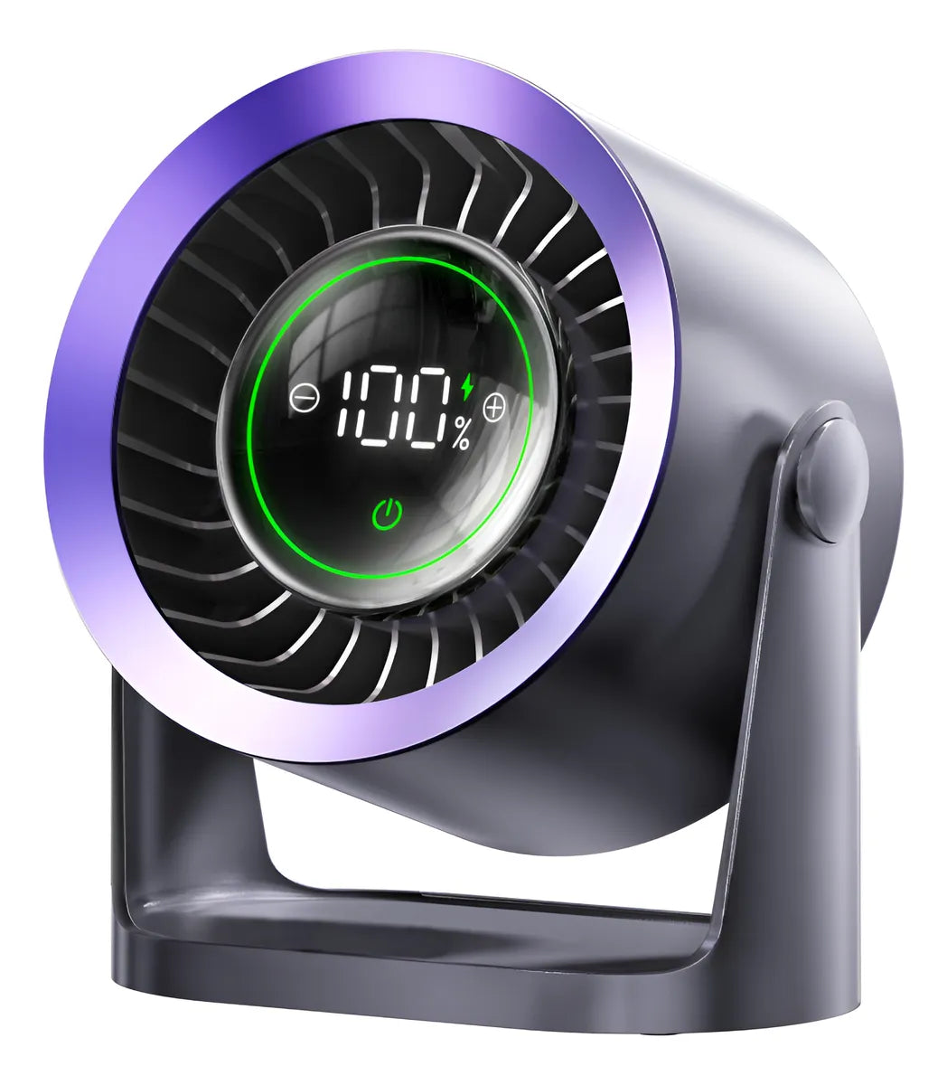 Más allá de su diseño moderno y compacto, este ventilador está lleno de tecnología pensada para tu confort. Con 100 velocidades ajustables, batería recargable de larga duración y un funcionamiento ultra silencioso, ofrece frescura personalizada en cualquier momento. Su pantalla digital, inclinación ajustable y diseño portátil lo convierten en la opción ideal para mantenerte cómodo en casa, en la oficina o donde vayas.